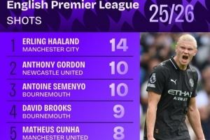 新赛季英超射门榜:哈兰德14次居首,B费、库尼亚、佩德罗在列