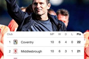 兰帕德执教考文垂本轮击败布莱克本,赛季10场不败高居英冠榜首